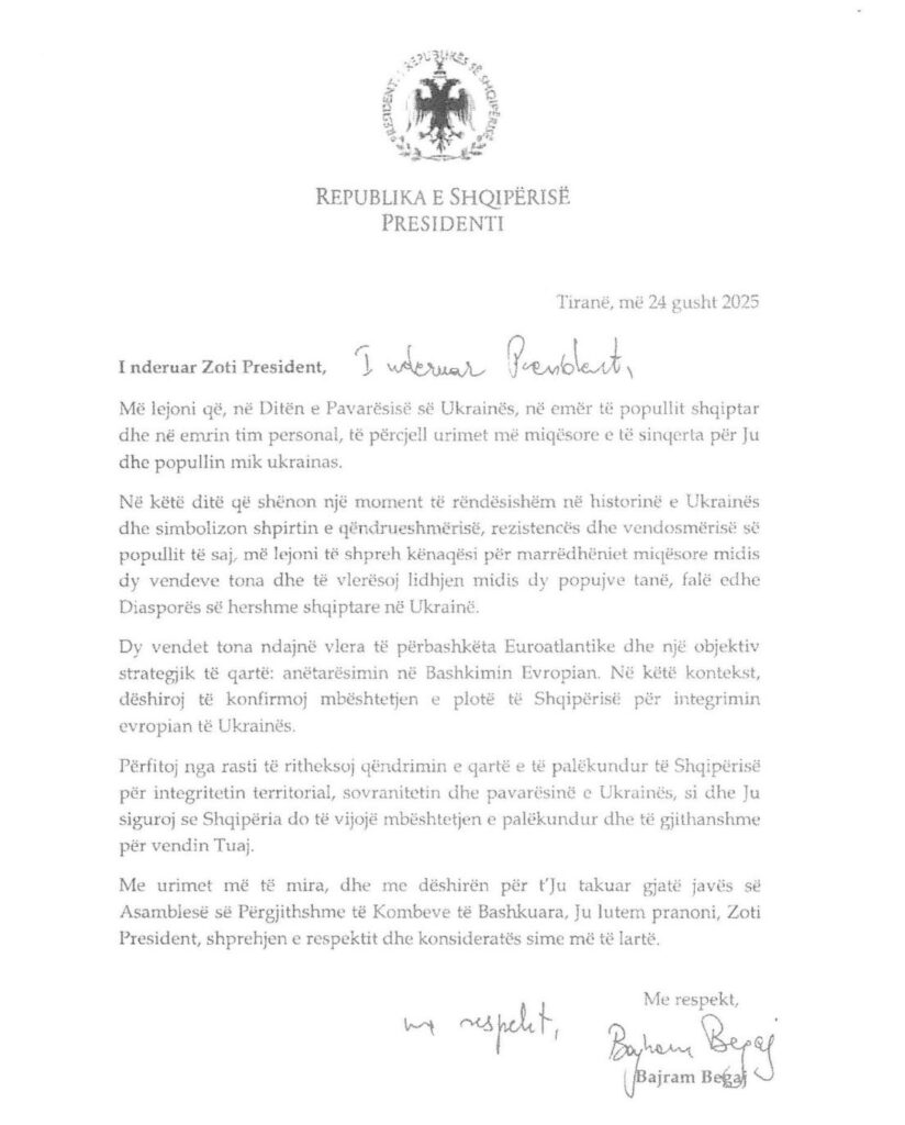 Përmes urimit të datës 24 gusht, Presidenti Begaj rikonfirmonte mbështetjen e plotë të Shqipërisë për integrimin europian të Ukrainës, si dhe qëndrimin e palëkundur për sovranitetin dhe integritetin territorial të saj.